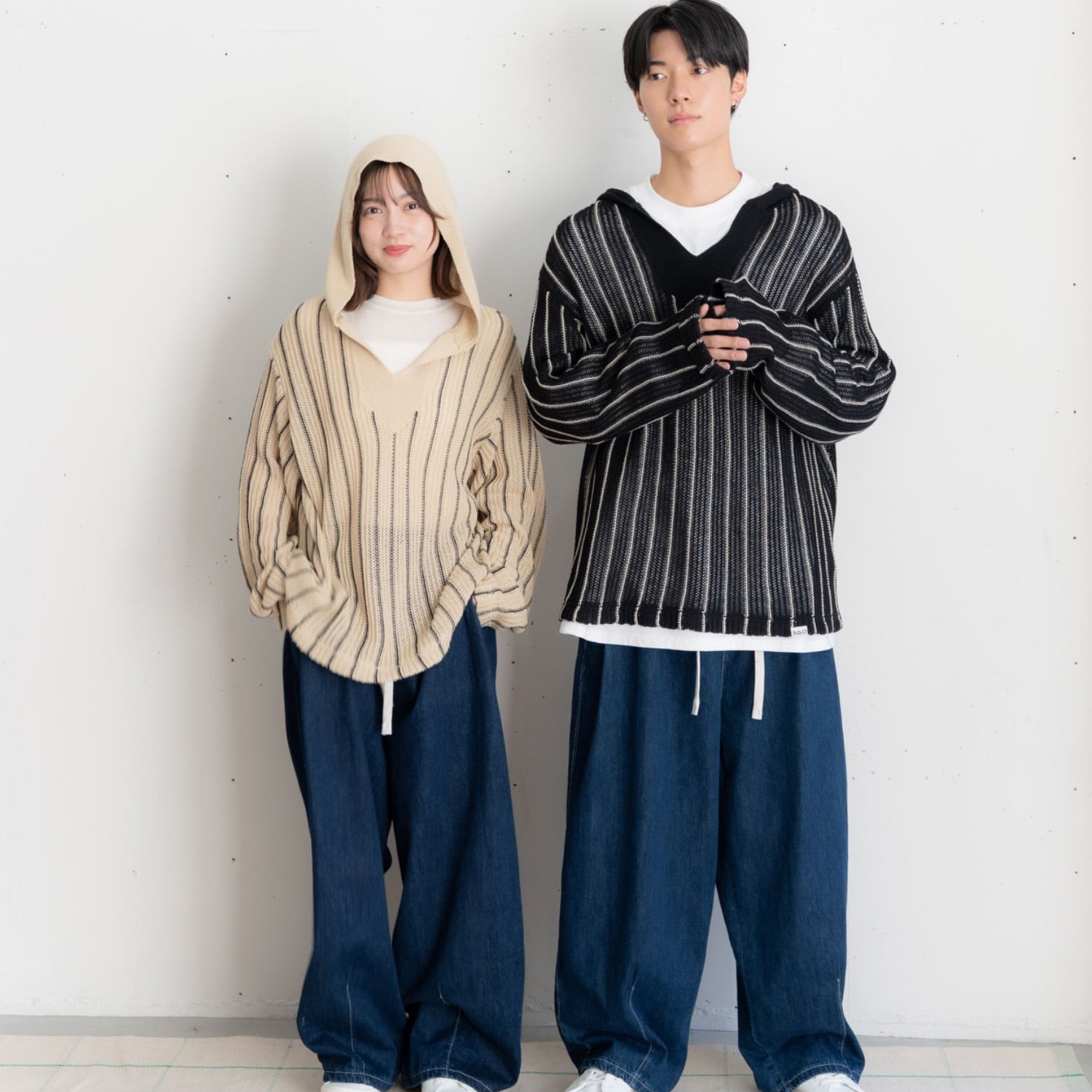 ストライプ柄を落とし込んだ、メキシカンパーカー風デザインが目を引く、b.b.Oのニットパーカー。
