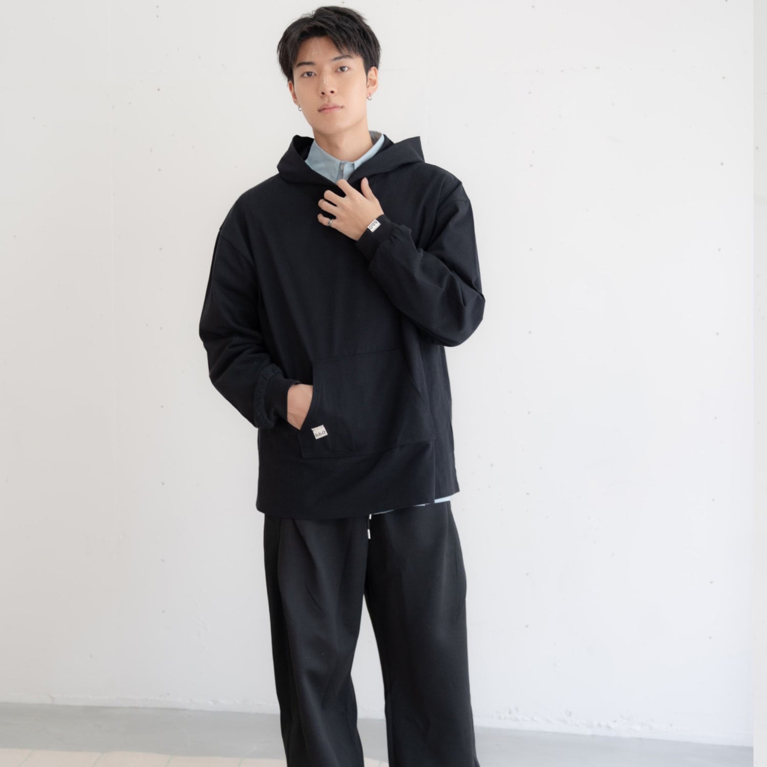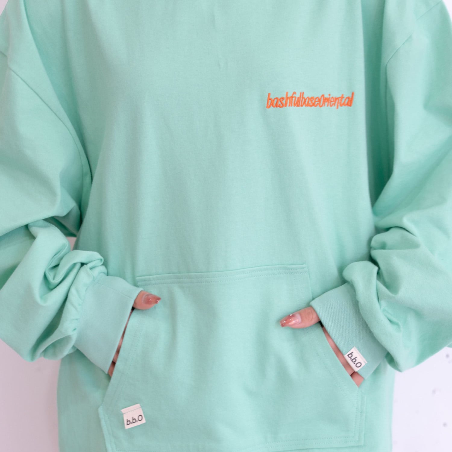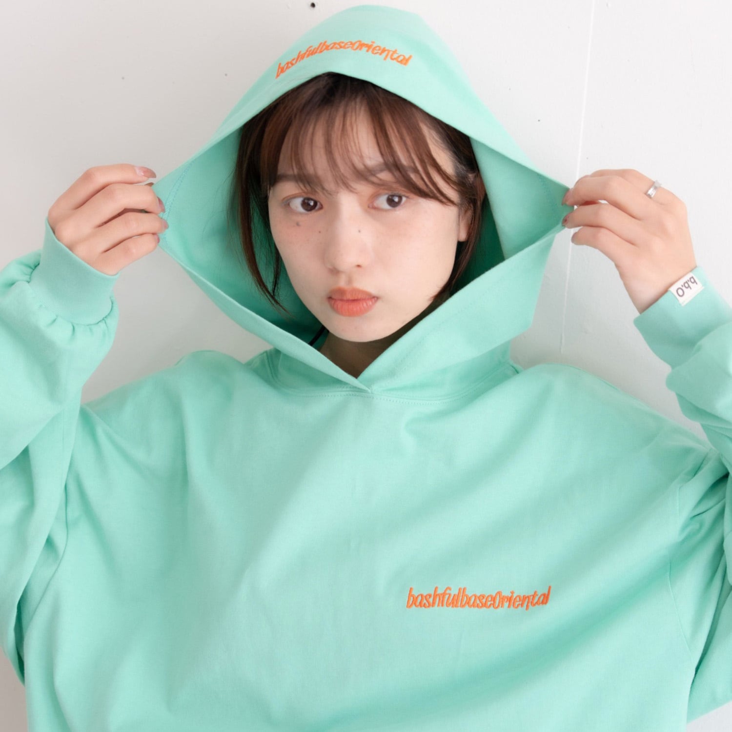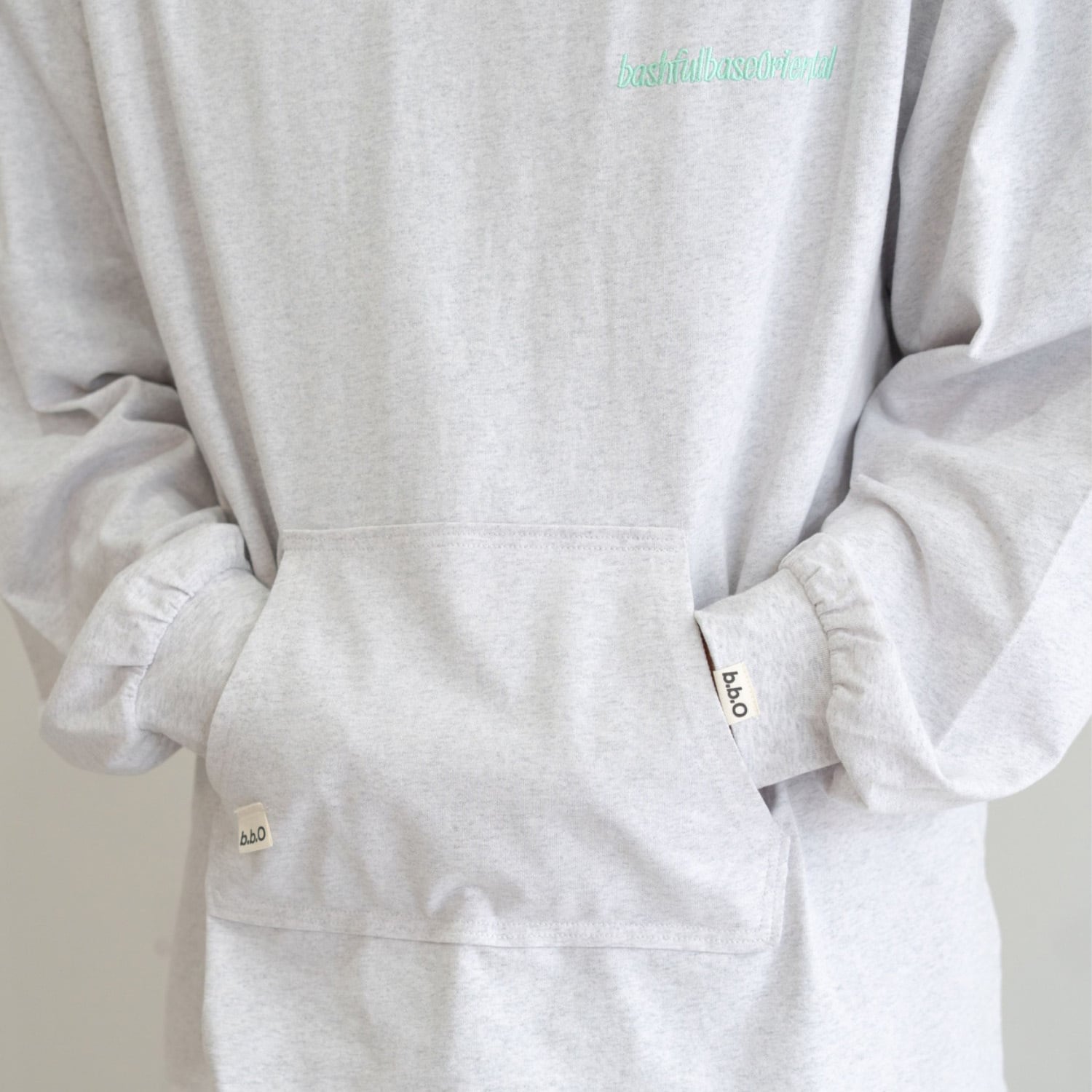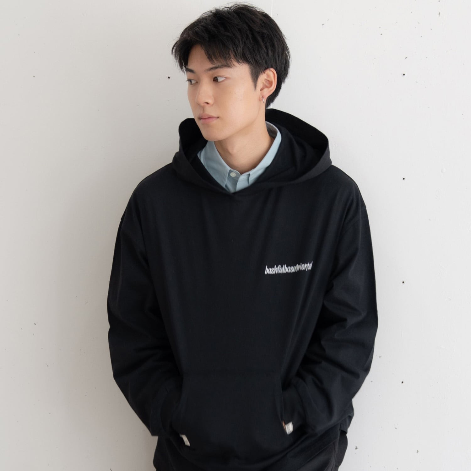 胸元とフード部分には、bashful base Oriental の刺繍ロゴを同色で配置。